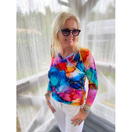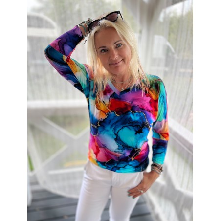 Otwórz drzwi nowym możliwościom stylu, zapraszając do swojej codzienności kolor, energię i radość dzięki tej niezwykłej kompozycji za każdym razem gdy założysz tę bluzkę.