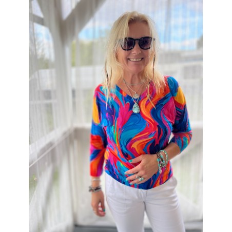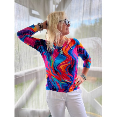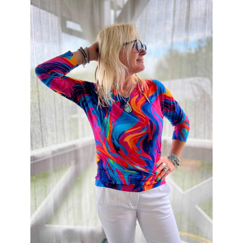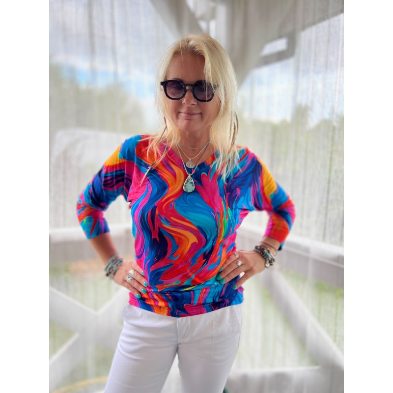 Otwórz drzwi nowym możliwościom stylu, zapraszając do swojej codzienności kolor, energię i radość dzięki tej niezwykłej kompozycji za każdym razem gdy założysz tę bluzkę.