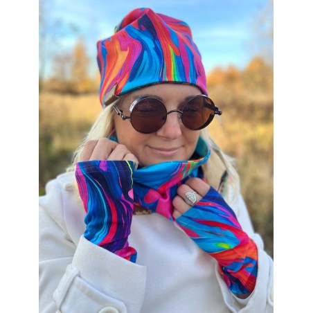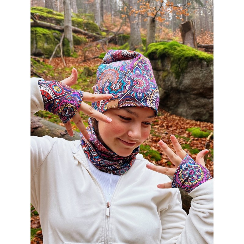 Na każdej wzór układa sie inaczej. Do kompletu komin można połączyć komin i rękawiczki Wygodna czapka z dwóch warstw bawełnianej dresówki, ładnie wykończona, dzięki czemu można ją nosić na obydwie strony.