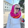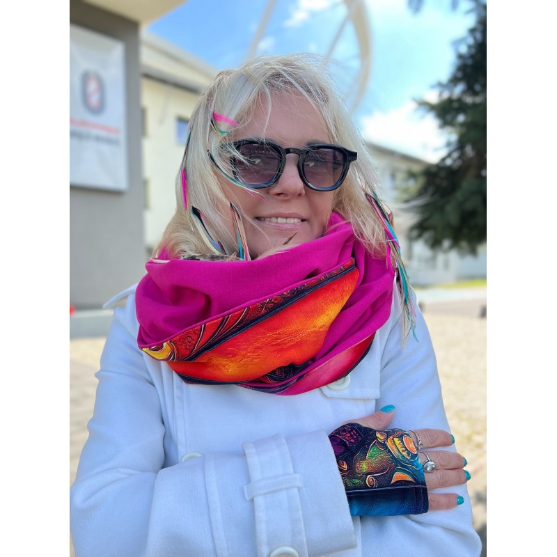 Komin z kapturem jest dwustronny, można go nosić również jako jednokolorowy. Jest idealną propozycją np. dla osób, które nie lubią nosić czapki. Chaber to dresówka grubsza.