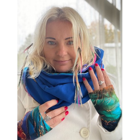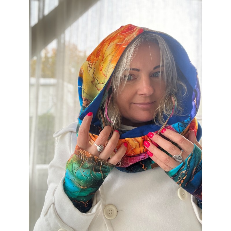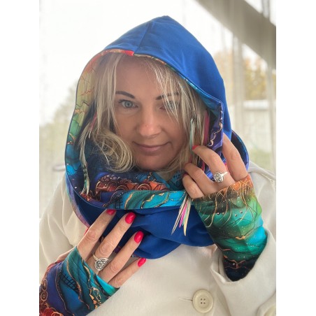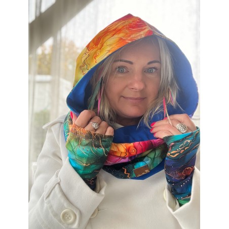 Komin z kapturem jest dwustronny, można go nosić również jako jednokolorowy. Jest idealną propozycją np. dla osób, które nie lubią nosić czapki. Nasze autorskie projekty powstają w pracowni we Wrocławiu.