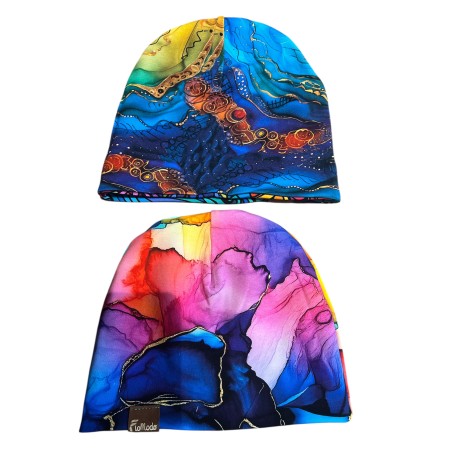 Wygodna dwustronna czapka z dwóch warstw bawełnianej dresówki To dwie czapki w jednej, na kazdej czapce wzór układa sieinaczej. Do kompletu jest komin i rękawiczki mitenki