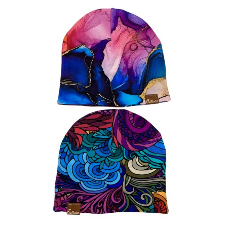Wygodna dwustronna czapka z dwóch warstw bawełnianej dresówki To dwie czapki w jednej, na kazdej czapce wzór układa sieinaczej. Do kompletu jest komin i rękawiczki mitenki