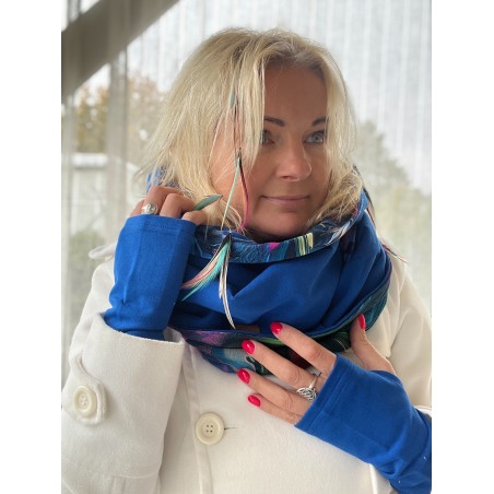 Komin z kapturem jest dwustronny, można go nosić również jako jednokolorowy. Jest idealną propozycją np. dla osób, które nie lubią nosić czapki. Nasze autorskie projekty powstają w pracowni we Wrocławiu.