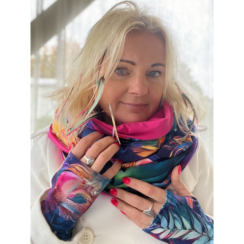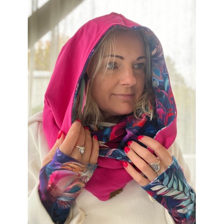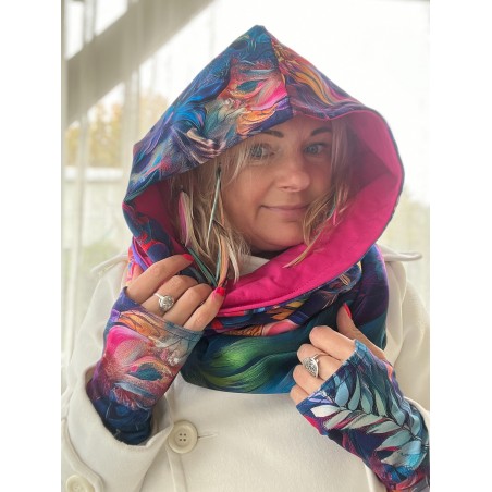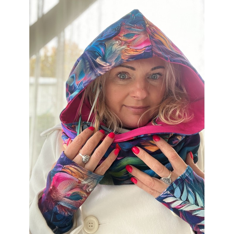 Komin z kapturem jest dwustronny, można go nosić również jako jednokolorowy. Jest idealną propozycją np. dla osób, które nie lubią nosić czapki.