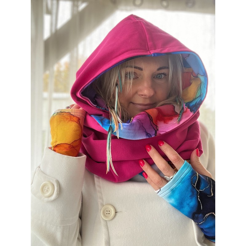 Komin z kapturem jest dwustronny, można go nosić również jako jednokolorowy. Jest idealną propozycją np. dla osób, które nie lubią nosić czapki. Nasze autorskie projekty powstają w pracowni we Wrocławiu.