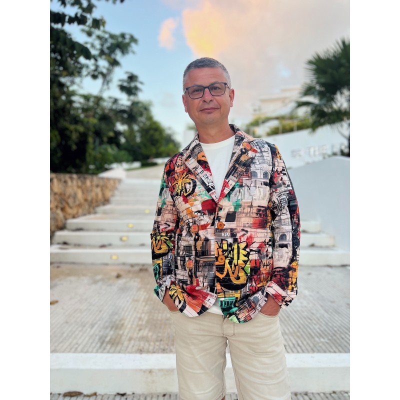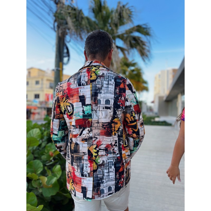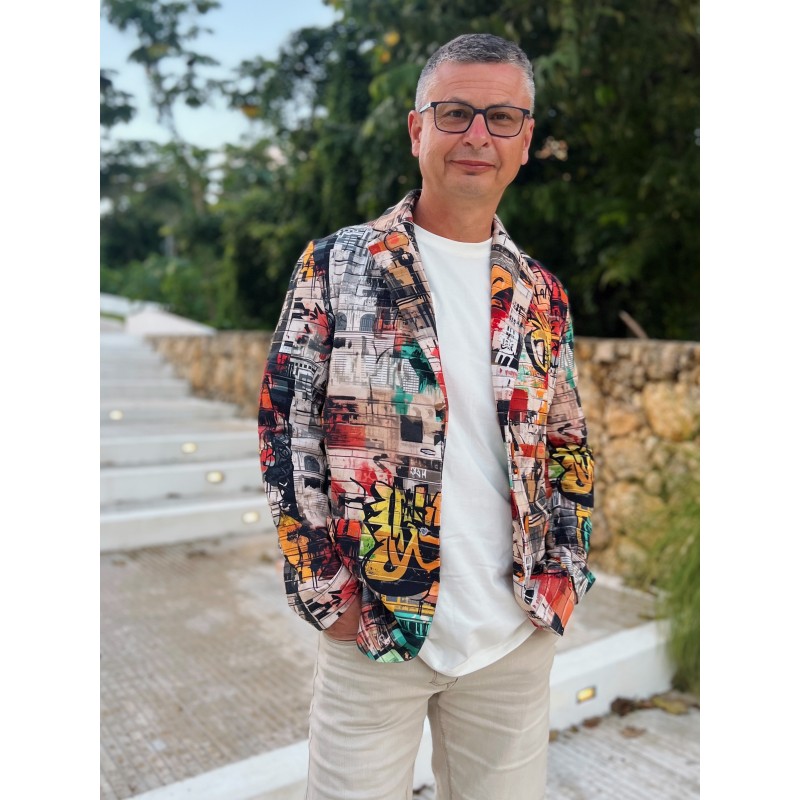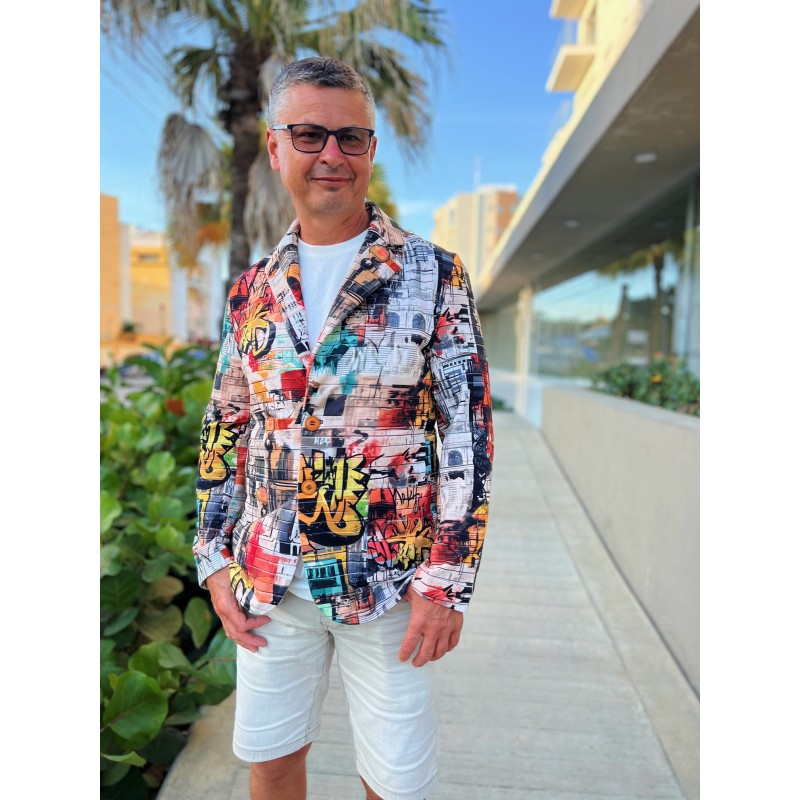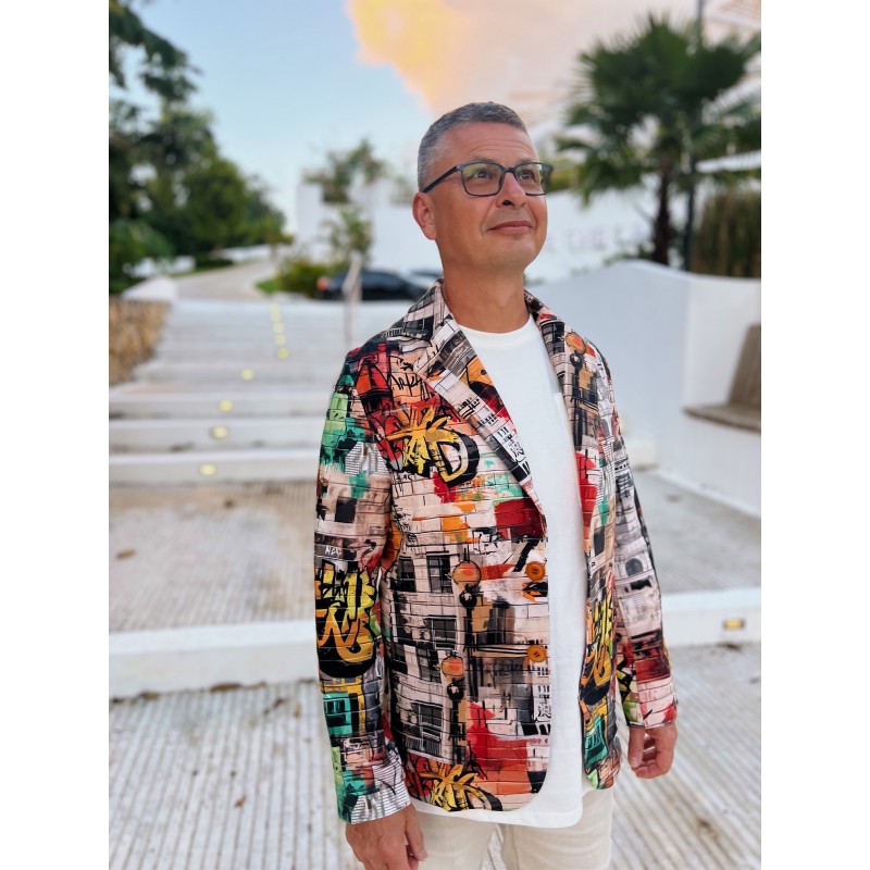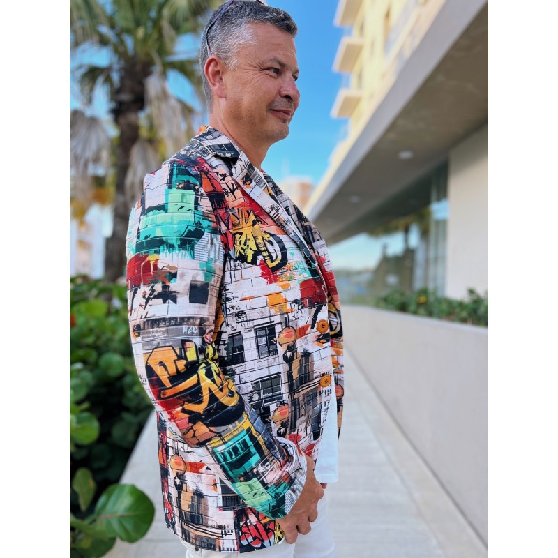 Otwórz drzwi nowym możliwościom stylu, zapraszając do swojej codzienności kolor, energię i radość dzięki tej niezwykłej kompozycji za każdym razem gdy założysz tę marynarkę.
