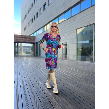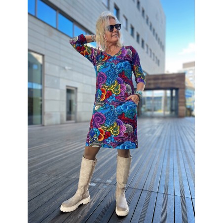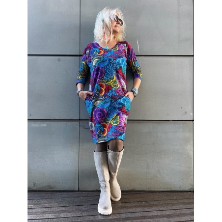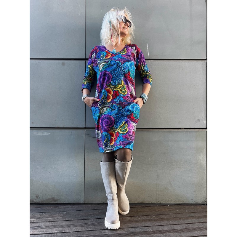 Wzór sukienki to wyrazista i oryginalna kompozycja kolorów, która nie tylko przyciąga spojrzenia, lecz także wzbudza wewnętrzną radość.