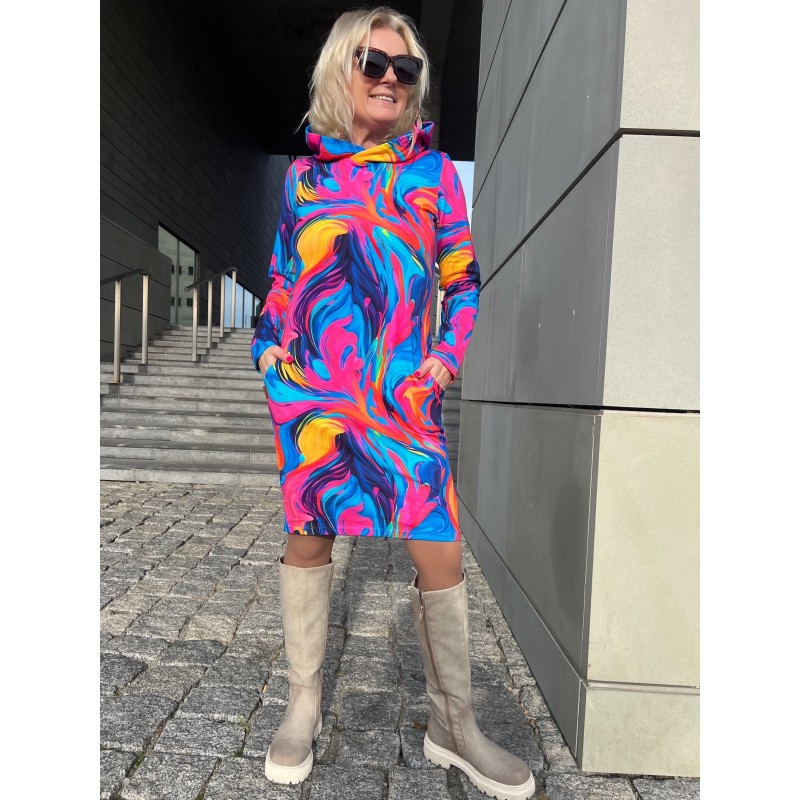 Wyraź się przez naszą sukienkę Ta sukienka to nie tylko ubranie, to manifestacja Twojej indywidualności. To świetny sposób na dodanie energii i charakteru każdej stylizacji. Otwórz drzwi nowym możliwościom stylu, zapraszając do swojej codzienności kolor, energię i radość dzięki tej niezwykłej kompozycji za każdym razem gdy założysz tę sukienkę. Rekomendacje dotyczące prania: - na lewej stronie - do 30 stopni - bez płynu zmiękczającego do płukania - bez suszenia w suszarce Skład i atesty: - bawełna 95% - elastan 5% - certyfikat Oeko Tex Standart 100 – tekstylia godne zaufania Z czego szyjemy - dzianina dresowa pętelka o gramaturze 240g z najwyższej jakości przędzy bawełnianej - nadruk cyfrowy, intensywne kolory i trwałość - po dodatkowym zmiękczaniu dzianina jest wyjątkowo miękka w dotyku. Na zdjęciu rozmiar S przy wzroście 160cm i wymiarach 90/80/90 Wybierając rozmiar kieruj się wymiarami ubrania mierzonego na płasko.