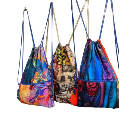 Worek jest uszyty z bawełnianej tkaniny, z przodu ma kieszonkę zapinaną na zamek. Sznurki do regulacji.